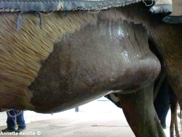 Large abdominal hernia in a mule. Lesions like this one can cause intestinal entrapment and torsion, often fatal without significant surgical intervention. A large number of patient presented with similar conditions, which may be related to excess pressure on abdominal wall from long-term carrying of heavy loads.