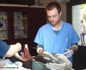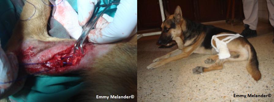 One of my patients in Morocco, presented plantigrade on the left rear leg and I suspected Achilles tendon rupture. The dog suffered a laceration injury on that leg from a knife wound during a fight. Left: suturing gastrocnemius tendon ends. Right: post-operatively, the patient should not use the affected leg for the next month to avoid tension on the tendon. Unfortunately, the dog never presented for re-check examination.
